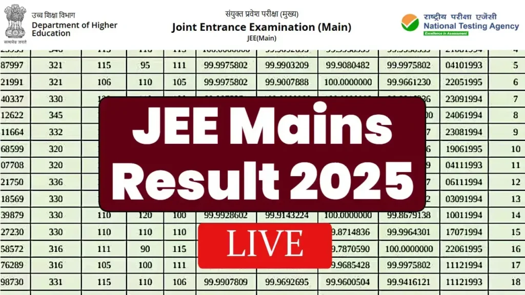 JEE Main Result Date Time 2025 (नेशनल टेस्टिंग एजेंसी जेईई मेन्स परिणाम), JEE Main Answer key National Testing Agency Jee Mains Session 2 Results Direct Link on jeemain.nta.ac.in, nta.ac.in, examinationservices.com LIVE Updates: नेशनल टेस्टिंग एजेंसी (NTA) की ओर से जेईई मेन 2025 सेशन-2 रिजल्ट कभी भी जारी किया जा सकता है। एनटीए द्वारा जारी ब्रोशर के मुताबिक सेशन 2 एग्जाम का रिजल्ट 17 अप्रैल 2025 तक घोषित किया जाना है। JEE Main Session 2 Result ऑनलाइन माध्यम से एनटीए की ऑफिशियल वेबसाइट jeemain.nta.nic.in पर जारी किया जायेगा।